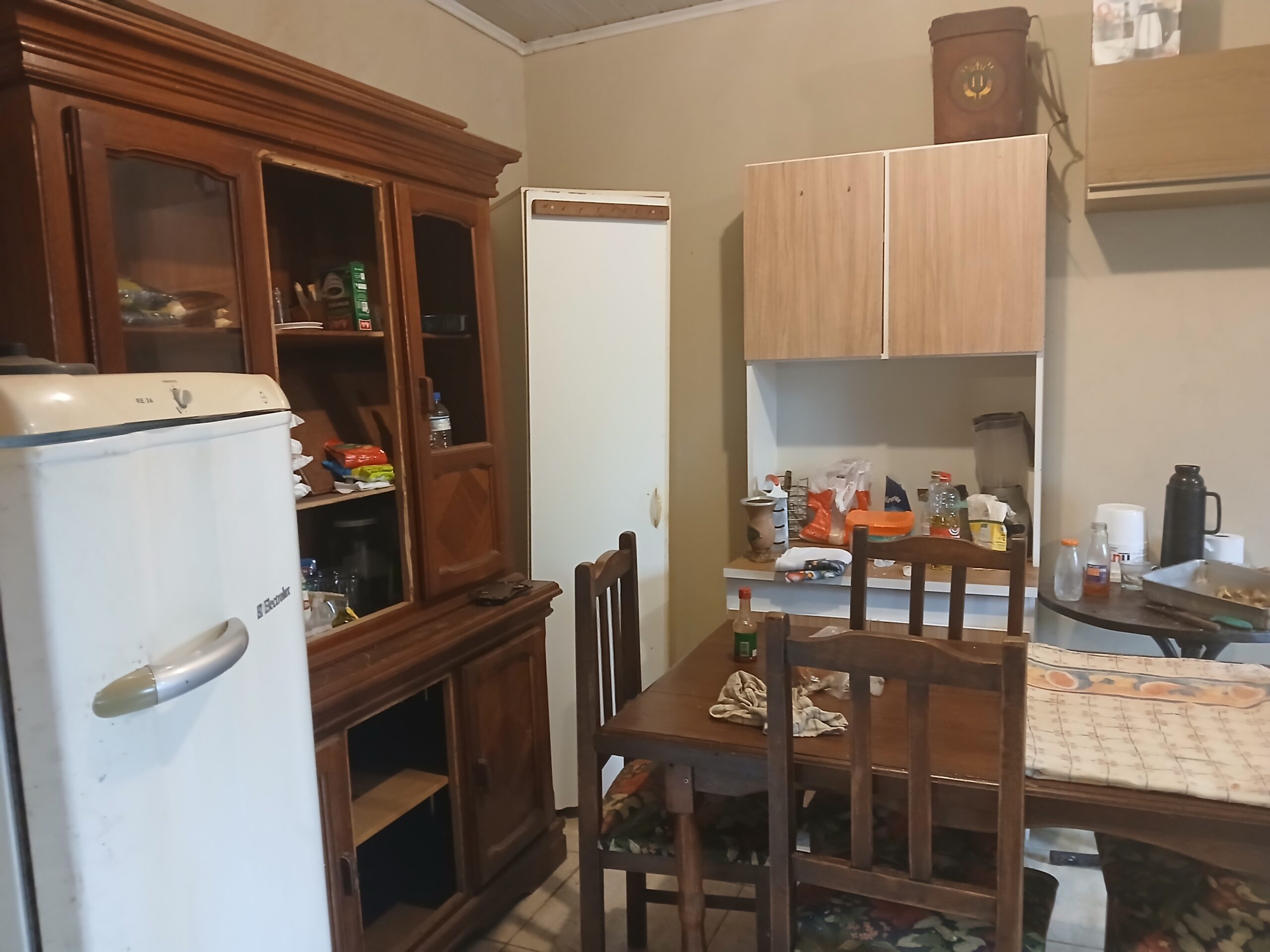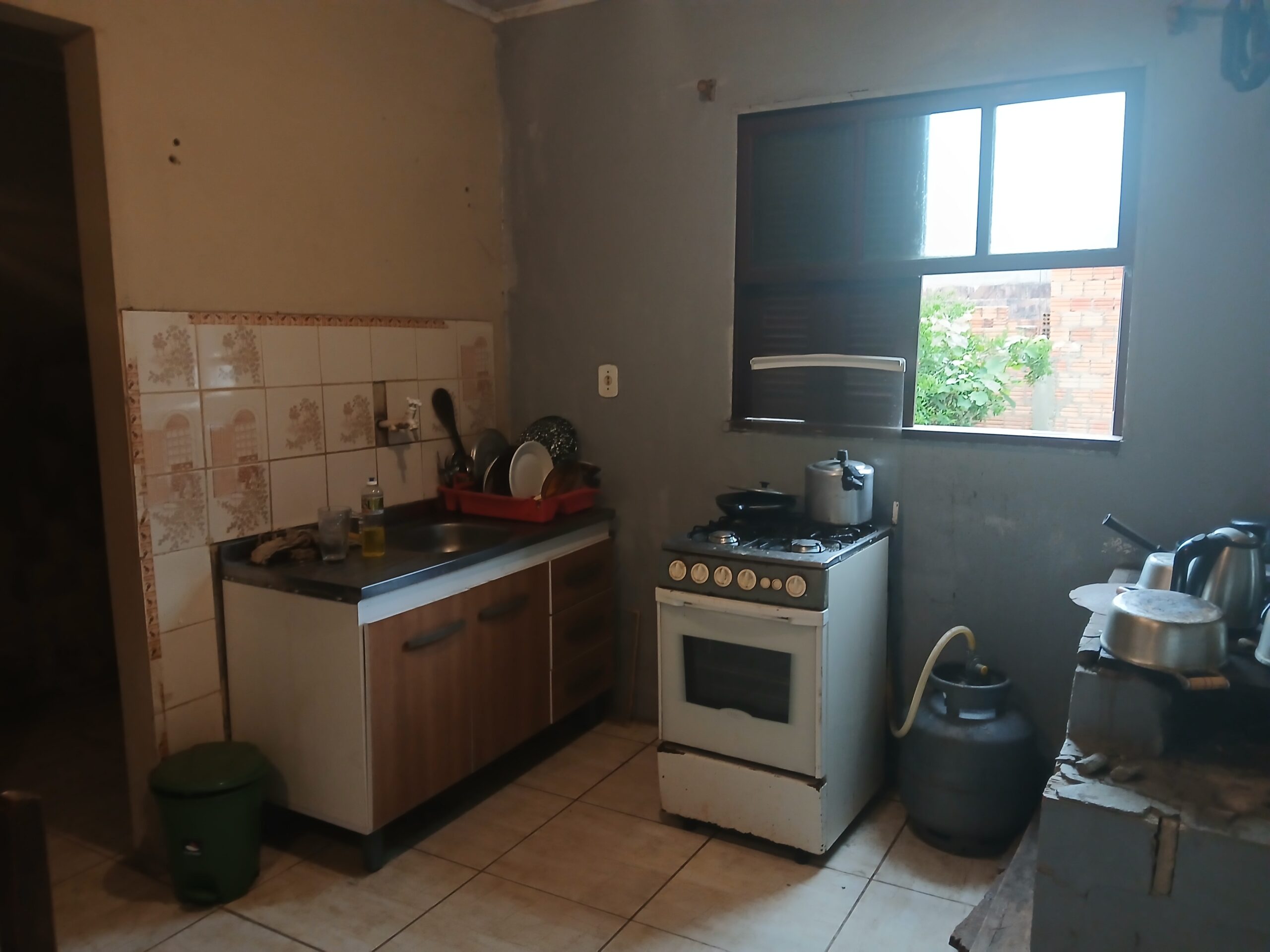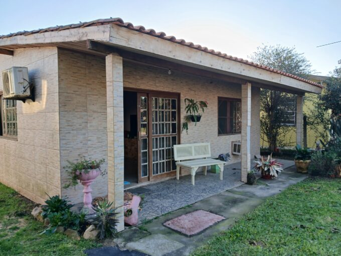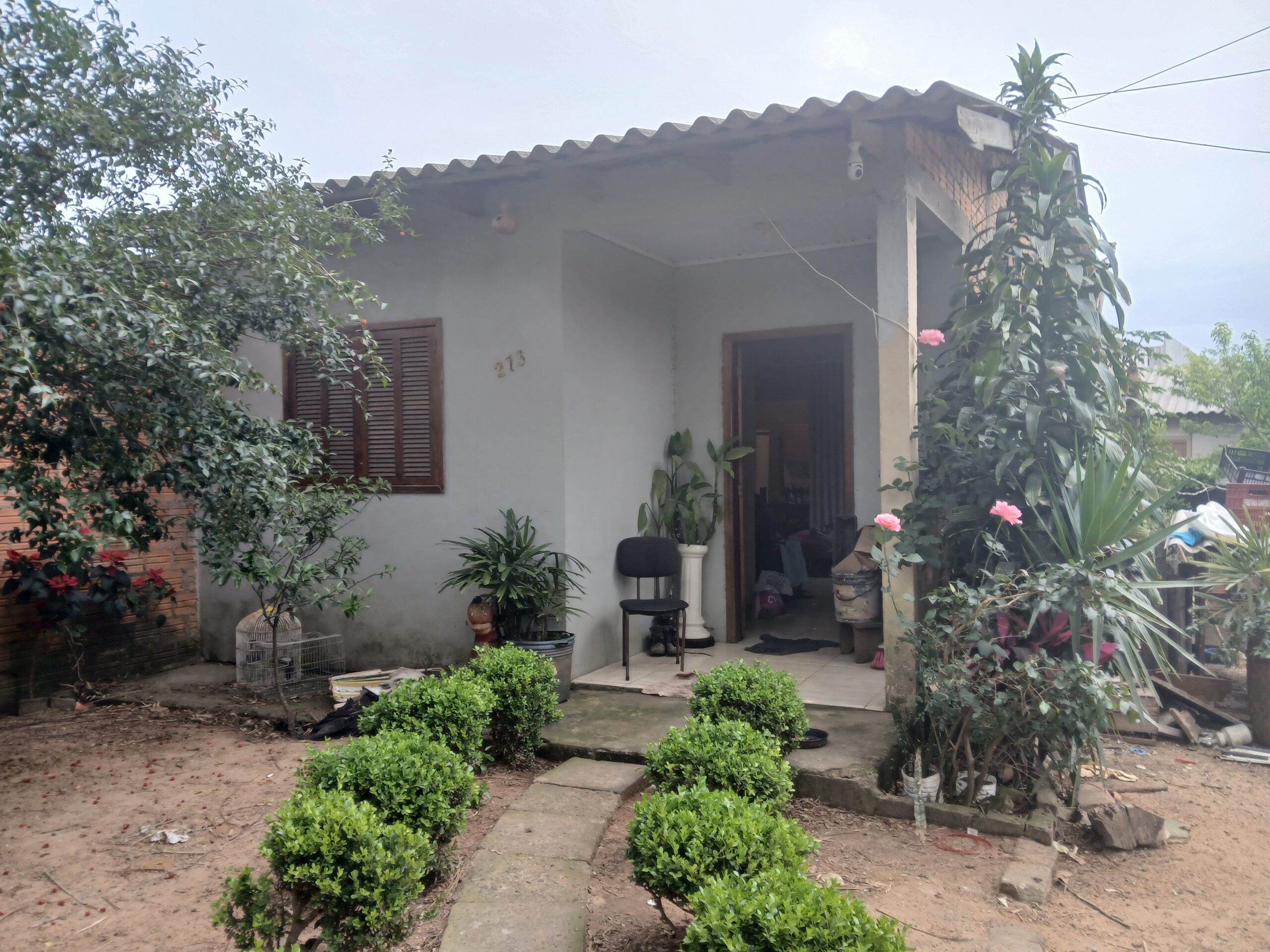 Casa com 2 dormitórios, sala, banheiro, cozinha com fogão campeiro.